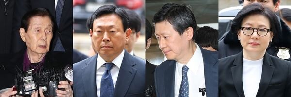 이날 재판에는 이들 세 부자(父子) 외에 신격호 회장의 맏딸 신영자 롯데장학재단 이사장과 셋째 부인인 서미경씨도 공동 피고인으로 출석했다.