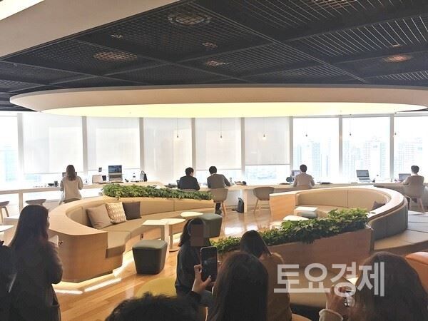 개인별 책상이 따로 없고 마치 분위기 좋은 카페처럼 앉아서 근무할 수 있다. 개인 물품은 캐비넷에 넣어두고 필요할 때 꺼내서 원하는 자리에서 근무하면 된다. 현장을 취재하던 기자들도 “이런 공간에서 근무하고 싶다”며 부러움을 표했다.