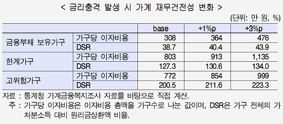 대출금리가 1%포인트, 3%포인트 상승시 금융부채 보유가구의 총부채원리금상환비율(DSR)이 38.7%에서 40.4%, 43.9%로 가계의 채무상환부담이 증가하는 것으로 나타났다. 이때 ▲한계가구의 경우 DSR은 127.3%에서 130.6%, 134.0%로 ▲고위험가구의 경우 DSR은 200.5%에서 211.6%, 223.3%로 큰폭 상승하는 것으로 나타났다. 부채상환능력이 취약한 가구를 중심으로 재무건전성이 크게 악화됨에 따라 이들을 중심으로 가계부채 문제가 악화되면서 실물시장으로 위험이 전이될 가능성이 있다.