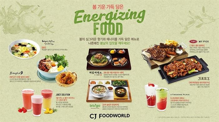 봄 맞이 에너자이징 메뉴로는 비비고의 ‘꼬막 솥밥과 된장찌개’, 계절밥상의 ‘돼지 직화구이’, 제일제면소의 ‘봄나물 차돌박이 비빔국수 세트’가 있다.