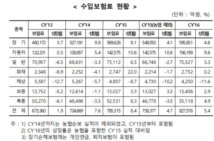 19일 보험개발원에 따르면 2016년 손해보험업계의 전체 수입보험료는 82조7576억원으로 전년보다 5.4% 증가했다.