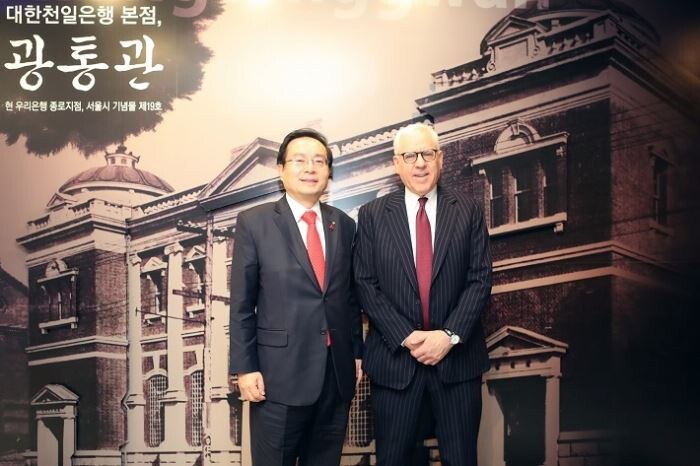 [토요경제=유승열 기자] 우리은행은 17일 서울시 중구 본점에서 손태승 행장이 세계 최대 사모펀드인 운용사 중 하나인 칼라일그룹의 공동창업주인 데이비드 루벤스타인 공동회장을 만나 주요 현안에 대해 논의했다고 19일 밝혔다.