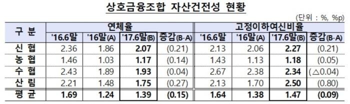 6월말 기준 연체율은 1.39%로 지난해 말보다 0.15%포인트 상승했으며 고정이하여신비율도 1.47%로 지난해 말보다 0.09%포인트 높아졌다.