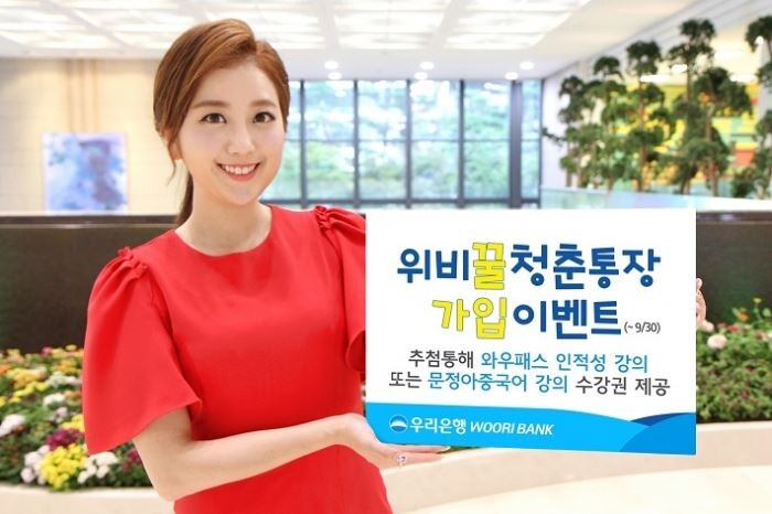 위비꿀청춘 통장 가입 이벤트는 9월말까지 위비꿀청춘 통장을 가입하고, 위비멤버스 혹은 위비톡을 가입하는 고객은 자동응모된다. 추첨을 통해 13만원 상당의 와우패스 인적성 온라인 강의 수강권과 교재를 90명에게, 17만원 상당의 문정아 중국어 3개월 수강권을 40명에게 각각 제공한다.