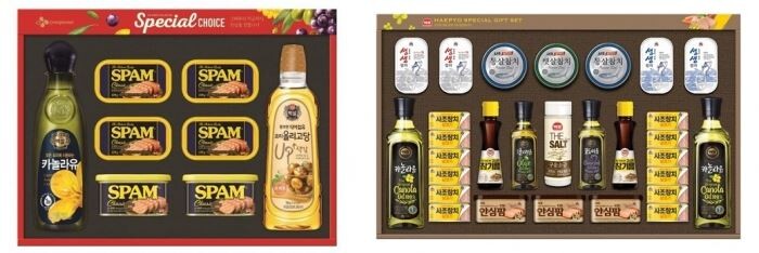 22일 업계에 따르면 CJ제일제당은 이날 다가오는 설 명절 시즌을 겨냥해 200여종의 다채로운 구성과 1만~8만 원대 다양한 가격대의 선물세트를 선보였다. 무엇보다 실용적인 선물 세트를 선호하는 트렌드에 따라 2만~4만 원대 중저가와 복합형 선물세트를 주력으로 내세웠다. 캔햄 선물세트 판매 1위인 스팸세트는 2만~7만 원대로 구성했다. 올해 설에는 The더건강한 캔햄 치즈 선물세트와 계절어보 선물세트를 새롭게 출시했다. 대표적인 복합형 선물세트인 특선세트는 스팸, 고급유 등을 기본으로 다양한 제품들을 담았다. 그 외 한뿌리 세트와 김 세트 등을 강화했다.