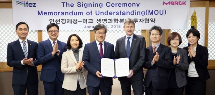 22일 인천경제자유구역청에 따르면 한국 머크 주식회사는 이날 인천경제청과 투자협약을 체결하고 221억 원의 사업비를 들여 한국 생명과학 운영본부를 송도에 짓기로 했다. 생명과학운영본부는 세포배양배지 제조와 공급·관련 서비스 제공을 주요 사업으로 하며 올해 상반기 착공해 내년 준공할 예정이다.