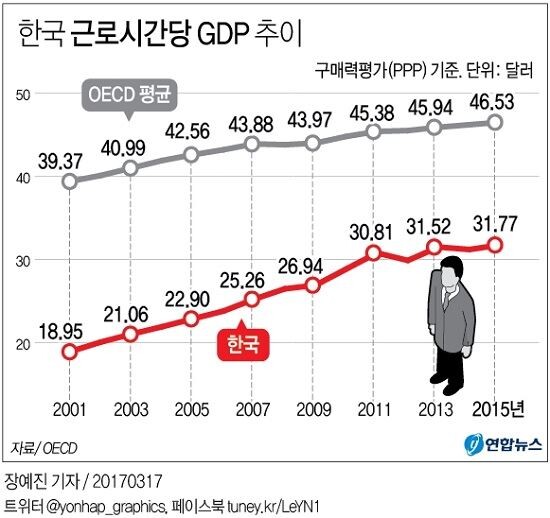 경제협력개발기구(OECD) 기준 우리나라의 연간 근로시간은 2015년 기준 2천113시간이다.