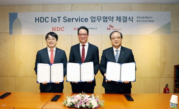 SK텔레콤과 HDC 현대산업개발, 홈네트워크 전문업체인 HDC 아이콘트롤스가 27일 오전 9시 현대산업개발 용산 사옥에서 아이파크 아파트 내 AI와 IoT 서비스를 적용하는 내용의 제휴 계약을 체결했다.