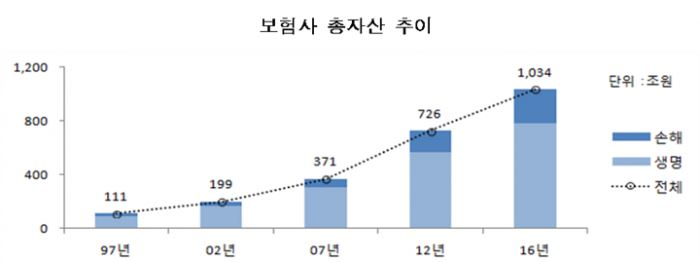 업권별로 보면 2016년 기준 생명보험의 총자산은 1997년보다 8.6배로, 손해보험은 14.3배로 증가했다. 수입보험료는 같은기간 생명보험이 2.4배, 손해보험은 5.2배 성장했다.