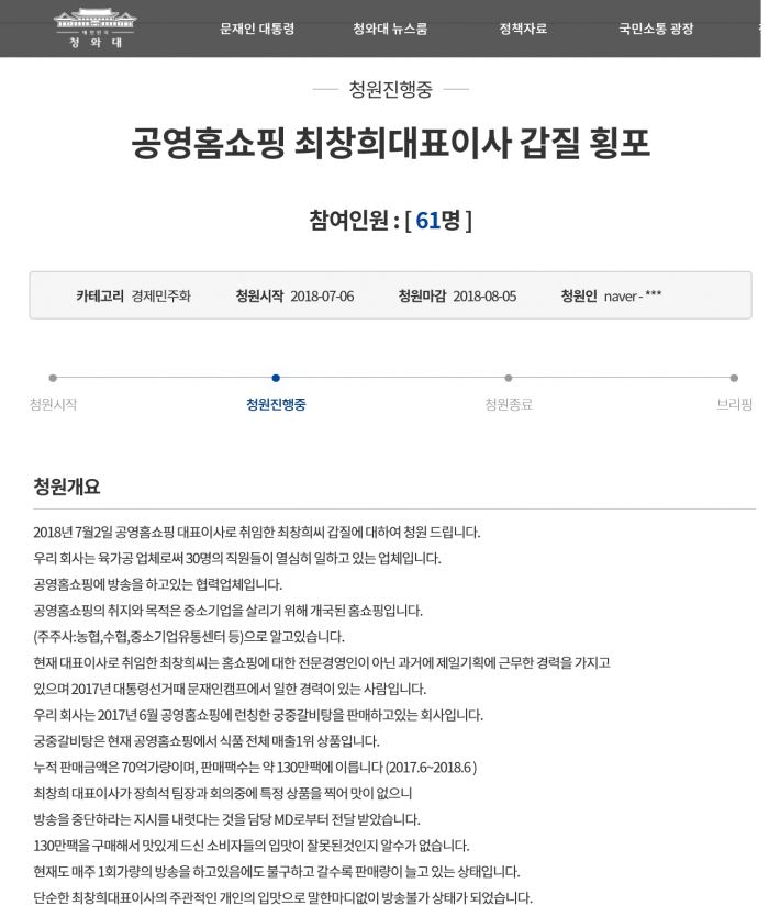 10일 국민청원게시판과 공영홈쇼핑에 따르면 지난 9일 청와대국민청원 게시판에 ‘공영홈쇼핑 최창희 대표이사 갑질 횡포’라는 제목의 고발글이 올라왔다.
