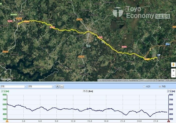 순례길은 정해진 코스나 구간이라는 개념이 없다. 오로지 시작과 끝이 있고 그 과정은 걷는 순례자가 직접 정하고 챙겨야 한다. 가이드북이 존재하지만 이또한 33~36일 일정으로 이렇게 걸으면 적당하는 기준이 될 뿐 이렇게 따라해야한다는 고정된 정보는 아니다. 말 그대로 안내서(가이드북)이다. 이번 프랑스길 루트를 걸을때는 외국 사이트의 일정을 참고로 했다. 단순히 거리로만 나누어 일정을 정한것이 아니라 머물러야하는 도시 위주로 코스를 정했다고 판단했기 때문이다. 그러다 보니 가끔 꽤나 긴 구간이 존재한다. 비야프랑카델 비에르소에서 오 세브레이로 가는길도 28km 오르막길이었고, Arzua 가는 길도 29km 정도 긴 거리이다. 33일 동안 30km 가까이 되는 구간 중 로그로뇨에서 나헤라 가는 29km 거리를 2번에 나누어 가는 경우를 제외하고는 모두 일정대로 소화했다. 오늘도 그렇게 장거리를 걸어야하는 코스이다.
