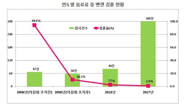 평가원은 국민이 자주 섭취하거나 많이 판매되는 과채음료류, 탄산음료, 두유류, 발효음료류 등 6종의 음료 300개 제품을 수거해 검사했다. 조사결과 조사 대상 300건 중 3건에서 벤젠이 평균 3ppb 검출됐으며 검출 수준은 먹는 물 벤젠 기준(10ppb)에 비해 낮은 수준이었다. 또 벤젠 실태조사 결과를 토대로 한 일일추정섭취량(EDI)을 평가한 결과 미국환경청(EPA)이 제시한 독성참고치 대비 0.00079%로 인체 위해발생 우려가 거의 없는 수준을 조사됐다.