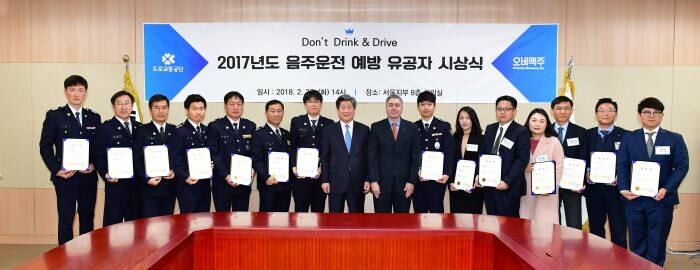 올해로 2회째를 맞이한 음주운전 단속 유공자 시상식은 오비맥주가 도로교통공단과 2016년 체결한 업무협약(MOU)에 따라 펼치고 있는 범국민 음주운전 예방 캠페인의 일환이다. 오비맥주 관계자는 “도로 위에서 위험을 감수하고 밤낮으로 고생하는 단속 경찰관들에게 감사의 뜻을 전하고자 행사를 마련했다”며 “주류 업계 선도 기업으로서 건전음주 캠페인을 펼쳐 개인뿐 아니라 사회적으로도 위험한 음주운전을 예방하기 위해 노력하겠다”고 말했다.