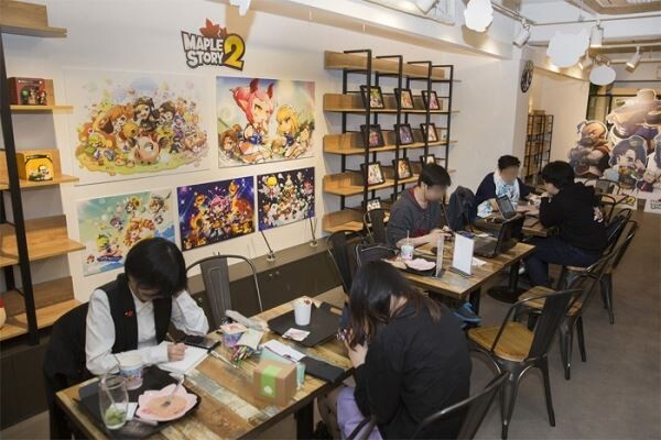 카페는 메이플스토리2 캐릭터와 이미지를 활용한 벽면 디자인, 천장 모빌 등으로 게임 속 분위기를 연출했다. 게임에 등장하는 메인마을 트라이아를 재현한 포토존과 유저 우수 팬아트 및 공식 일러스트를 감상할 수 있는 전시 공간도 마련됐다.