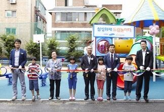 ▲ 2014년 6월 삼성화재와 강동꿈마을 관계자, 원아들이 놀이터 개관 커팅식을 진행하고 있다. <사진=삼성화재>