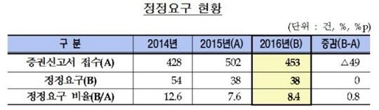 금감원은 453건의 증권신고서 중 중요사항을 누락하거나 불분명하게 기재한 38건(8.4%)에 대해 정정을 요구했다. 시장별로는 코스닥 상장사의 정정요구 비율이 23.6%로 유가증권상장사의 6.6%, 비상장사 1.1%보다 월등히 높았다.