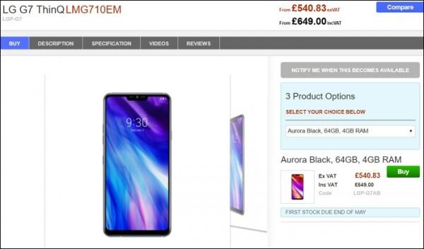[토요경제=정동진 기자] LG G7 씽큐의 출고가격에 업계의 관심이 몰린 가운데 4일(현지시간) 영국의 한 온라인 쇼핑몰에서 대당 649파운드(94만8000원)에 사전 주문을 받기 시작했다.