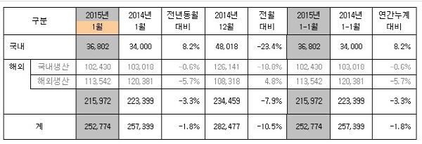 올 1월 해외시장에서 기아차는 국내공장 생산분 10만2430대, 해외공장 생산분 11만3542대를 포함한 총 21만5972대로 전년보다 3.3% 감소했다.