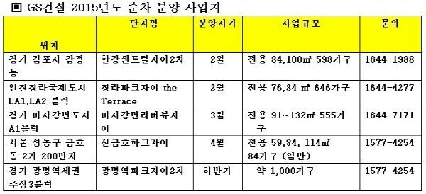 이와 관련 GS건설은 이달 김포에 '한강센트럴자이 2차'를 시작으로 인천 청라·경기 미사강변·서울 성동구 금호동 등 서울 도심과 공공택지에서 2차 사업을 진행한다고 3일 밝혔다. 특히 GS건설은 '자이 브랜드타운' 조성을 위한 시리즈 분양에 나서 올 상반기 수도권을 중심으로 하는 사업계획을 최종 확정했다.