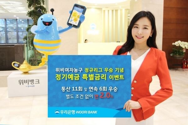 [토요경제=유승열 기자] 우리은행은 '신한은행 2017~2018 여자프로농구' 정규리그 우승을 기념, '위비여자농구 정규리그 우승기념 정기예금 특별금리 우대 이벤트'를 시행한다고 5일 밝혔다.