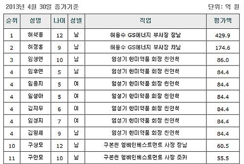 그러나 이번에 허 부사장의 아들 허석홍(12)군과 정홍(9)군의 나이가 10살 안팎의 미성년 신분이라는 점을 감안하면, 이들이 수백억대의 재산증여를 받은 사실은 서민들에게는 적잖은 허탈감을 주고 있다.