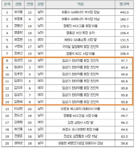 특히 한미약품 임성기 회장의 손주 7명이 국내 상장사 미성년 주식부자 상위 20위권 안에 들어있어 이목을 집중시켰다.