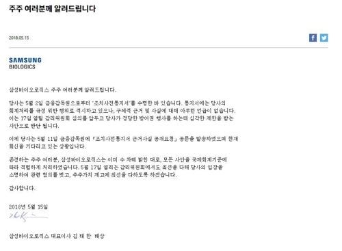 삼성바이오로직스는 이날 홈페이지에 김태한 사장 명의의 '주주 여러분께 알려드립니다'는 글을 게시했다.