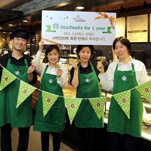 스타벅스는 400만 회원을 기념, '마이 스타벅스 리워드'400만 번째 회원은 '골드' 레벨로 즉시 승급해주고, 1년간 톨 사이즈의 제조 음료를 매일 한 잔씩 무료로 준다.