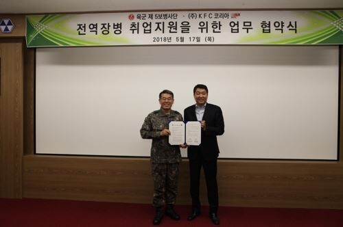 [토요경제=이선주 기자] KFC는 17일 육군 5사단과 ‘전역장병 취업 지원을 위한 업무협약식’을 갖고 이 사단 출신 전역 장병이 입사를 지원할 경우 1차 서류심사를 면제해주기로 했다.