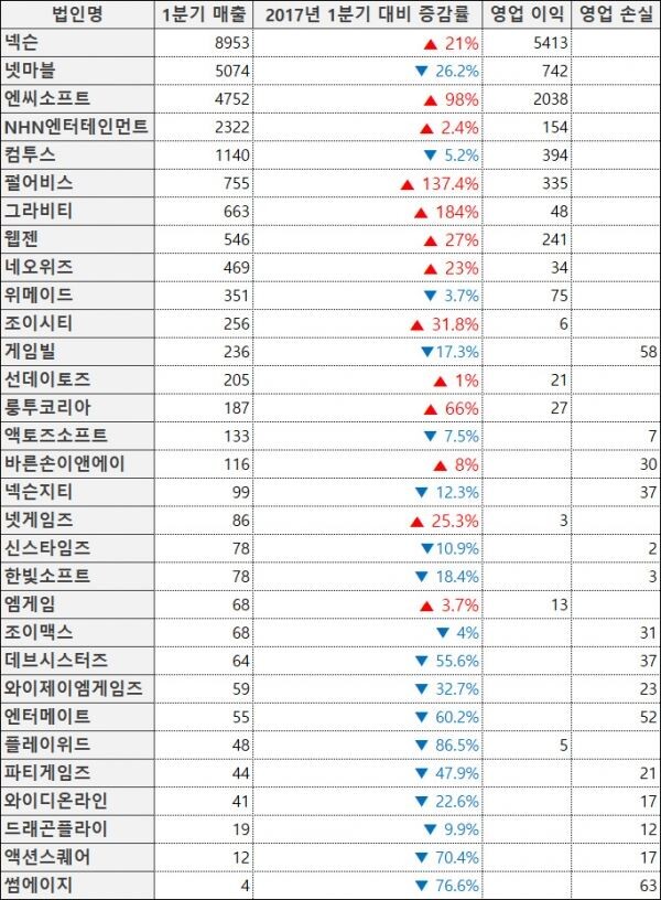 이른바 '3N'인 넥슨, 엔씨소프트, 넷마블과 화제의 주인공으로 떠오른 펄어비스를 제외하면 중견 게임업체는 대부분 영업손실을 기록했다.
