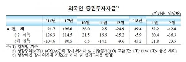한은 관계자는 "2월 증권투자자금이 유출된 것은 위험회피 성향 강화에 따른 단기적인 성격이 강하다"며 "중순 이후 불안 심리가 회복되면서 증권투자자금 유입이 우세했다"고 했다.
