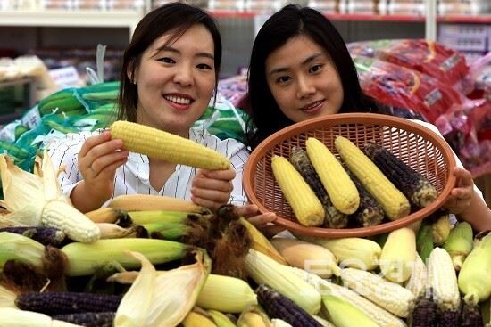 농협유통 직원들이 15일 오전 서울 농협하나로마트 양재점에서 올해 첫 출하된 경남 의령지역의 햇찰옥수수를 선보이고 있다. <사진=연합>