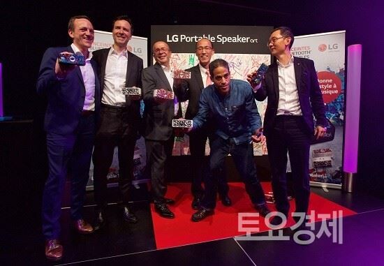 LG전자가 14일(현지시간) 프랑스 파리의 복합문화단지 레알 힙합문화센터에서 포터블 스피커 신제품 출시행사를 했다고 15일 밝혔다. 신제품은 LG 포터블 스피커 미니에 존원의 작품을 입힌 'LG 포터블 스피커 미니 아티스트 시리즈' 3종으로 그라피티 특유의 자유로운 느낌을 살리고자 워터슬라이드 기법을 적용했다. 김진홍 LG전자 프랑스법인장 전무(오른쪽 첫번째)와 존원(오른쪽 두번째). <사진=LG전자>