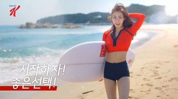 ▲ 19일 농심 켈로그는 여름 피서철을 앞두고 강소라와 함께 시원한 동해 바닷가를 배경으로 촬영한 '스페셜K'의 새로운 TV광고를 17일부터 공개했다고 밝혔다. 2년 연속 스페셜K의 메인 모델로 선정된 강소라는 푸른 바닷가에서 강렬한 레드 컬러의 래시가드를 입고 황금 비율을 뽐내며 본격적인 여름 바캉스 시즌을 앞둔 소비자들의 몸매관리 욕구를 자극한다. <사진=켈로그>