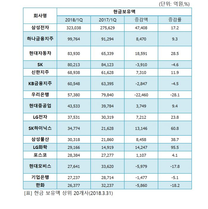 현대차그룹은 현대차와 현대모비스, 기아차, 현대건설 등 4개 계열기업이, SK그룹은 SK와 SK하이닉스, SK이노베이션, SK텔레콤 등 4개 계열기업이, LG그룹은 LG전자, LG화학, LG디스플레이, LG 등 4개 계열기업이 각각 현금 1조 원 이상이었다.