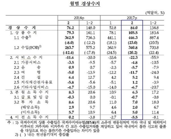 5일 한국은행이 발표한 ‘2017년 2월 국제수지’(잠정)에 따르면 상품과 서비스를 포함한 경상수지 흑자는 84억 달러로 집계됐다. 지난 2012년 3월부터 60개월 연속 흑자를 기록하면서 최장 흑자 기록을 경신했다.