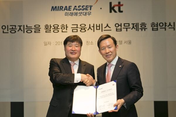 KT는 미래에셋대우와 서울 종로구 포시즌스 호텔에서 ‘인공지능을 활용한 금융서비스 제공을 위한 업무협약(MOU)’을 체결했다고 5일 밝혔다.