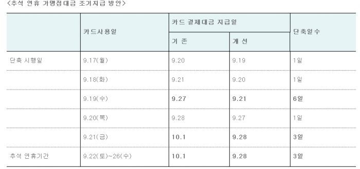 영세·중소가맹점의 자금애로 해소를 지원하기 위해 226만개 카드사용에 따른 가맹점대금 지급주기도 단축한다. 현행은 카드사용일+3영업일이지만, 추석 연휴기간(22~26일)에는 카드사용일+2영업일로 단축한다.