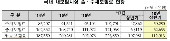국내 재보험거래로 인한 수지차는 3125억원이었으며, 해외 재보험거래로 인한 수지차는 1822억원으로 집계됐다. 상반기 해외 수지차는 1822억원으로 전년동기대비 1429억원 개선됐다. 해외수재로 인한 수지흑자는 1531억원이고, 해외출재로 인한 수지적자는 3353억원이었다.