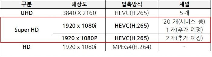 Super HD 채널은 기존 HD채널보다 선명한 UHD급 화질로 1080i와 1080P 두 가지 방식으로 구분된다. 현재 1080i 방식의 Super HD 채널 20개를 다양한 인기 장르 채널에 적용해 UHD 고객에게 제공하고 있으며, 연내 1개 채널을 추가할 예정이다.