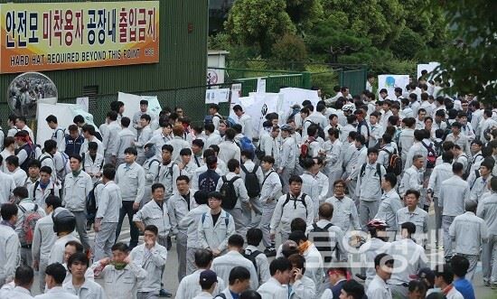 28일 오후 경남 거제시 삼성중공업 거제조선소 정문 앞에서 삼성중공업 노동자협의회 근로자들이 사측의 강도높은 구조조정안에 반발해 파업 찬반 투표를 하고 있다. <사진=연합>