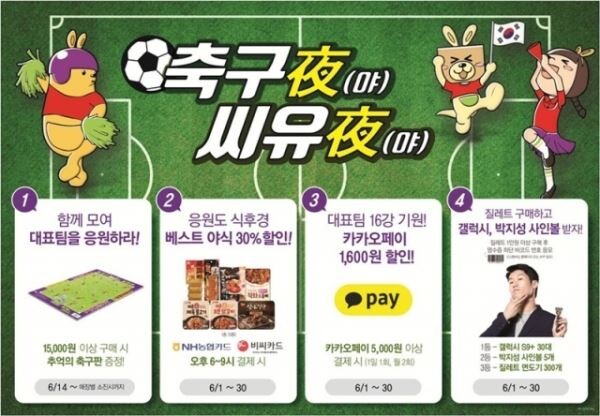 주요 경기 시간대인 오후 6~9시 사이에 BC카드와 NH농협카드로 결제하면 야식상품을 30% 할인해준다.