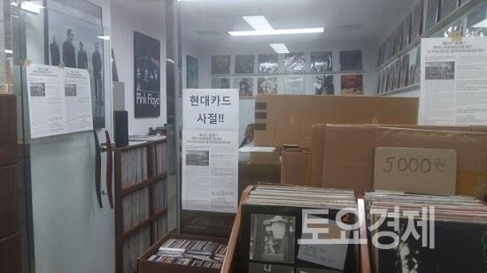 [토요경제신문=조은지 기자] 회현역 지하상가에 있는 LP상가들은 현대카드 보이콧을 진행하고 있는것을 30일 확인했다. 현대카드는 앞에서는 소상공인과의 상생을 도모한다며 뒤에서는 골목침해상권으로 논란이 일고 있다. <사진=조은지 기자>