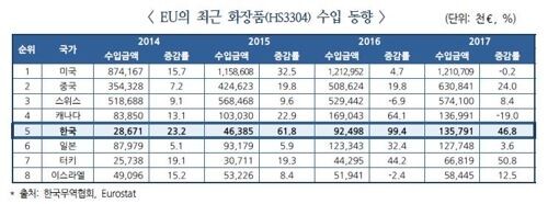 5일 한국무역협회 브뤼셀 지부가 발표한 '유럽 K뷰티 붐과 마케팅 전략' 보고서에 따르면 지난해 우리나라는 일본을 제치고 유럽의 5대 화장품 수입국에 올라섰다.