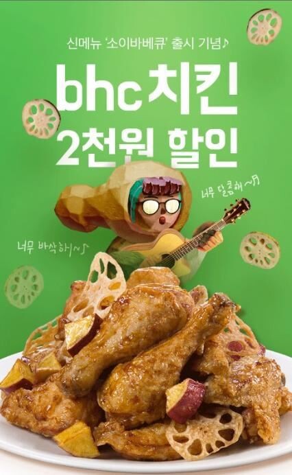 할인 구매를 희망하는 고객은 '배달의 민족' 앱에서 바로결제로 bhc치킨 메뉴를 주문하고 결제할 때 쿠폰코드에 'bhc소이바베큐'라고 입력하면 자동할인 받을 수 있다.