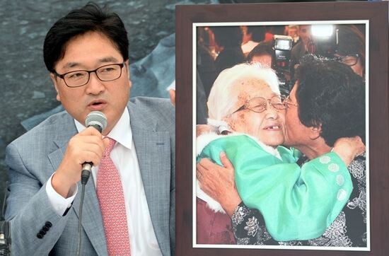 9일 오전 서울 중구 시청 서울광장에서 열린 민주당 최고위원회의에 참석한 우원식 최고위원이 가족의 이산가족 상봉 사진을 들어보이며 상봉과 관련한 발언을 하고 있다. (사진=뉴시스)