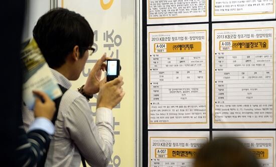 ▲ 지난 5일 대전무역전시관에서 열린 ‘2013 KB굿잡 창조기업 취·창업박람회’에 참석한 시민이 채용게시판 내용을 카메라에 담고 있다.