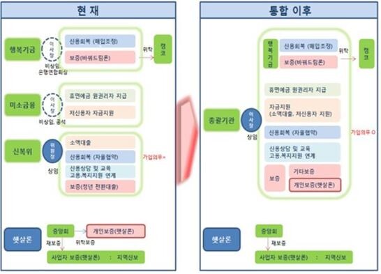 개선방안의 주요 내용을 살펴보면 서민금융 유관기관(국민행복기금·신복위·미소금융)을 통합해 종합적·유기적으로 서민금융을 지원하는 체계가 구축된다.