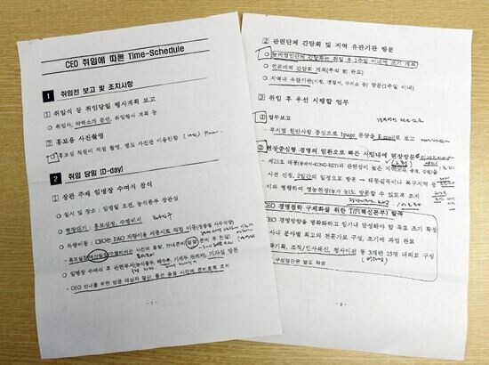 해당 문건에는 특정인이 농어촌공사 사장으로 취임 후 진행할 ▲취임전 보고 및 조치사항 ▲취임 당일 차량 이동경로 ▲취임 이후 주요 일정 등이 상세히 작성돼 있다. 뿐만 아니라 ▲전략기획·조직/인사쇄신·청사이전 등 3개반 15명 내외 조직 구성 ▲CEO 경영철학 구체화를 위한 T/F(혁신본부) 발족 등 취임 후 우선 시행할 업무 내용까지 자세하게 나와 있다.