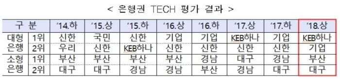 28일 금융위원회가 발표한 ‘2018년 상반기 은행권 기술금융 실적평가(TECH 평가) 결과’에 따르면 대형은행 중 그룹 1위는 KEB하나은행이 2위는 IBK기업은행이 차지했으며, 소형은행 중 그룹 1위는 BNK부산은행이, 2위는 DGB대구은행이 차지했다.